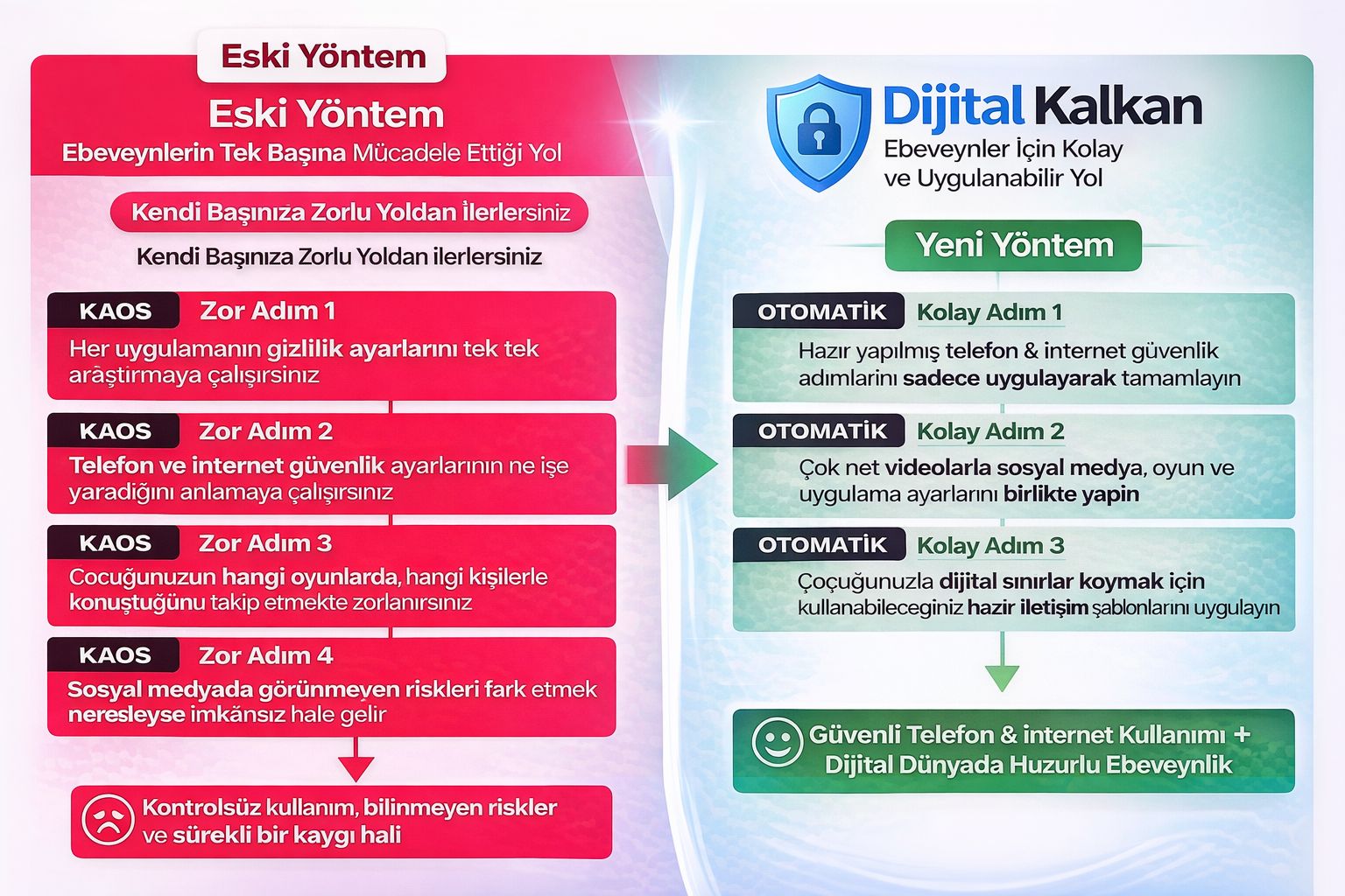 Fakat dürüst olalım: Bu ayarların çoğu karmaşık. Platformlar sürekli değişiyor. Ebeveynler yalnız bırakılıyor. İşte bu yüzden, ebeveynlerin yıllardır mücadele ettiği bu büyük sorunu çözmek için Dijital Kalkan Modeli’ni geliştirdik.